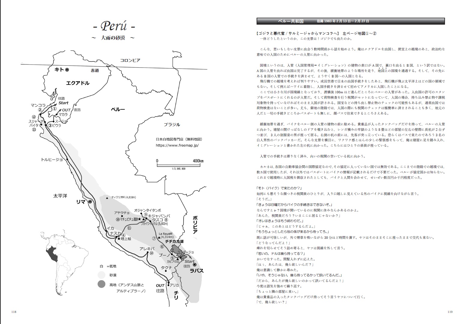 現在とは違ってネットもスマホもデジカメもない時代。不便だけどまだまだ「未知の荒野」が残っていた良き時代の話です。そんな世界を文字通り風の吹くままに,アメリカのロスアンゼルスからアルゼンチンの世界最南端の町ウスアイアを折り返し,メキシコまで戻った1年半の約7万kmのバイク放浪旅です。観光要素は殆どなく,各国に暮らす人々との交流やチカ(娘)たちとの赤裸々な恋バナ,出逢った海外のバイクカーたちと過ごした日々など,当時の空気感の中で感じた想いを書き下ろした極めて個人的な内容です。