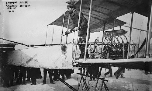 一方,フランスでは既に前年の1907年に,ヴォアザン兄弟社の機体を使って,アンリ・ファルマン(Henri Farman)がヨーロッパ飛行距離記録を樹立していた。1908年彼は,27kmの距離を20分という時間で飛行しているが,速度に換算すると実に時速80kmにもなる。更にこの年,彼もヨーロッパで初めて乗客を乗せて飛行している。下の写真は1908年年頭に行われたドイツ航空カップで優勝した操縦者のファルマンとヴォアザンが制作した機体。奇しくもこの年には,有名なツェペリン飛行船 LZ IVの炎上事故が起こっている。
